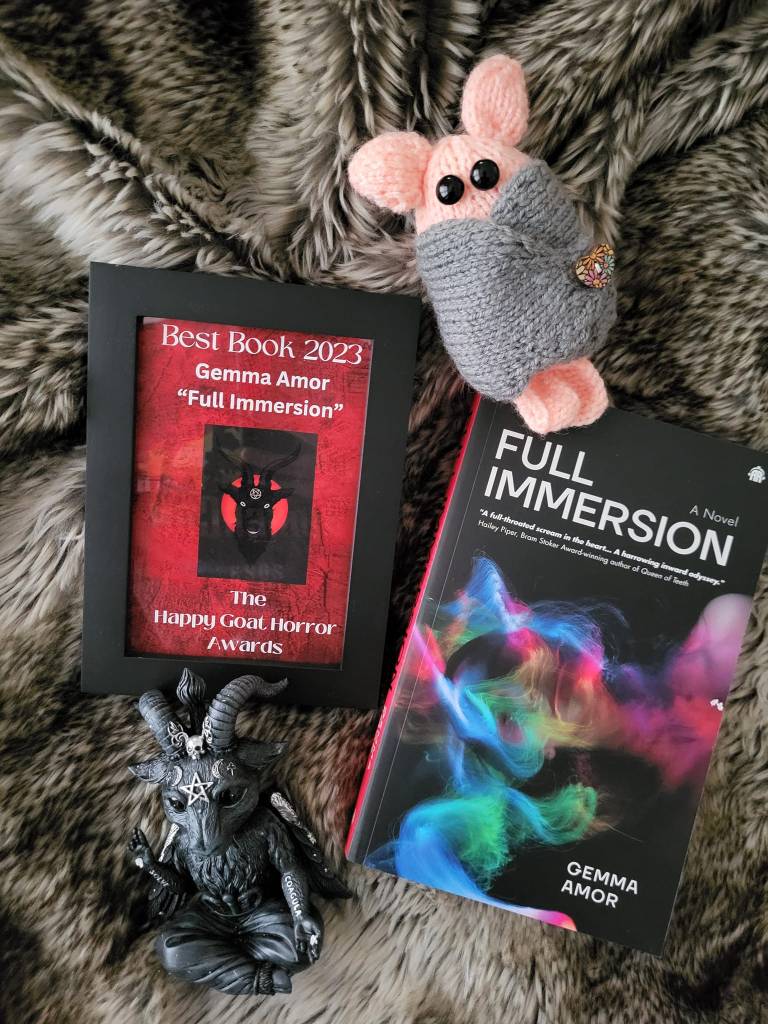 The winners of The Happy Goat Horror Awards 2023 were Gemma Amor (Best Book of 2023) for Full Immersion, and Justin Park (Outstanding Contribution to Horror) for his work running the Sinister Horror Company. Images swiped from the recipients’ social media!